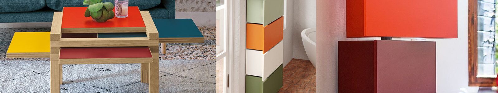 Een salontafel met verwisselbare plankjes – en elk plankje heeft 2 kleuren: boven- en onderkant. Draai, wissel, combineer... zo verander je je interieur met een kleine handeling telkens opnieuw.