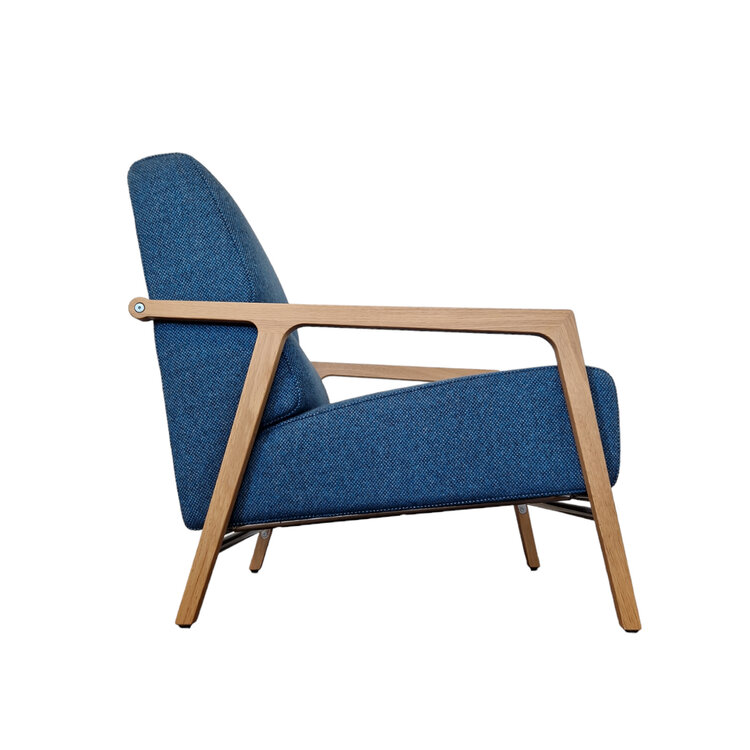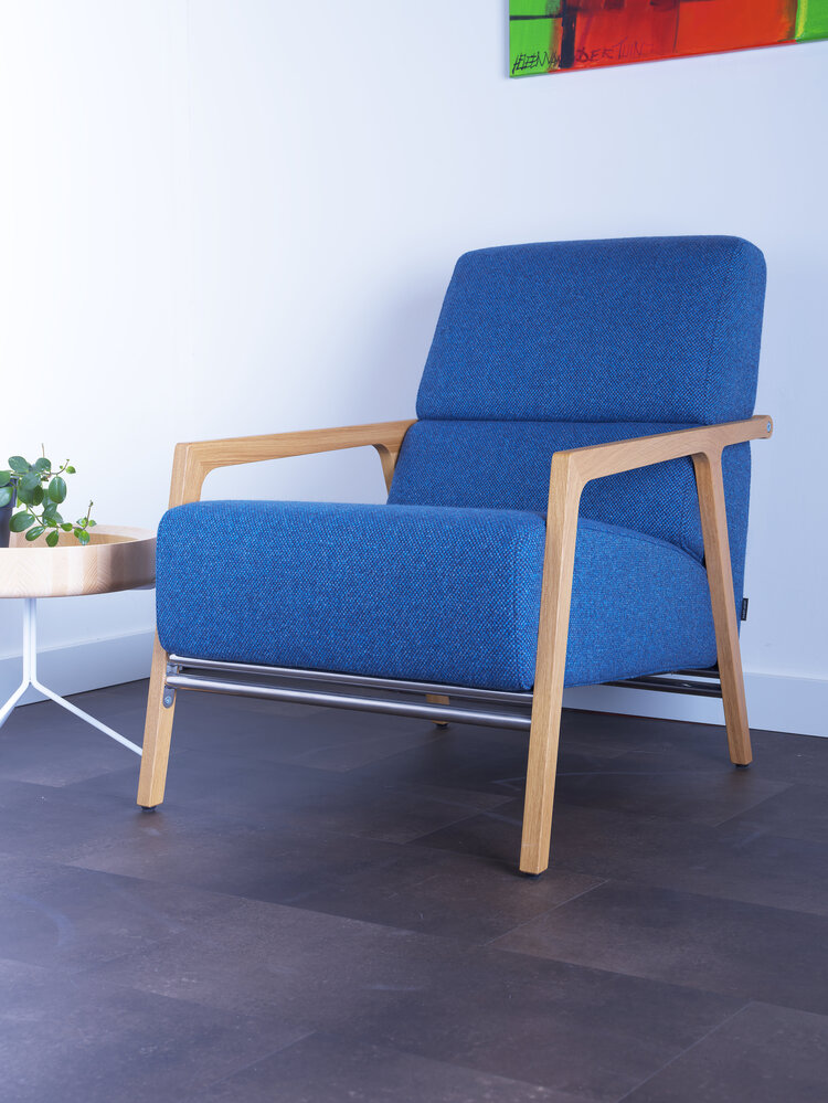 Materiaal:Frame: Staal, afwerking poedercoatArm: Massief hout, Amerikaans noten of eikenVulling: Zit - HR schuin, rug - HR schuinDoppen: Kunststof of vilt