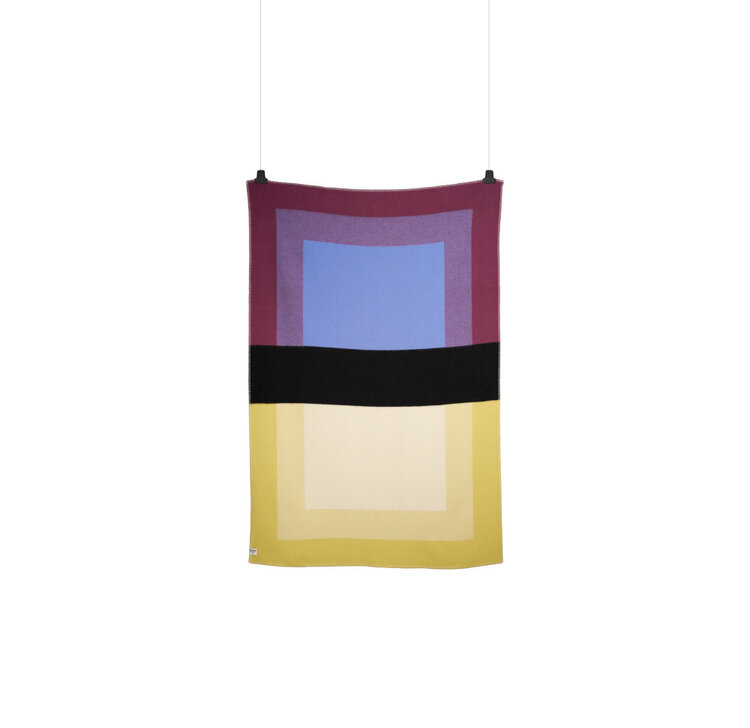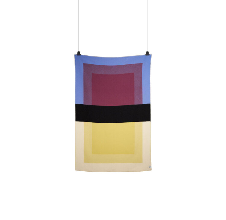De Bento-serie is gemaakt met het oog op veelzijdigheid en een evenwichtige samenwerking tussen de elementen. De serie heeft drie hoofdfuncties: als zelfstandig object, als een belangrijk onderdeel van de sfeer in een ruimte, en in interactie met het lichaam. De opvallende zwarte "riem" verdeelt de deken visueel in twee delen en geeft het een dynamische, grafische uitstraling. Materiaal: