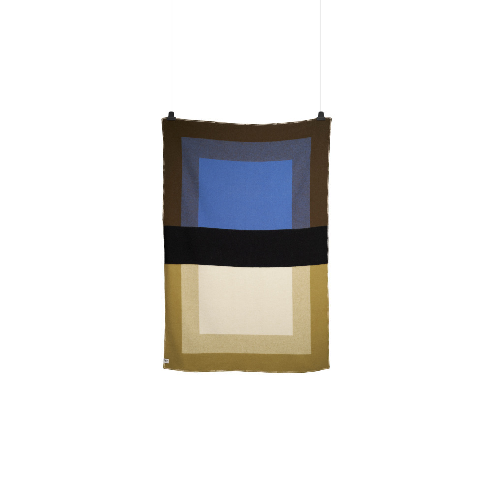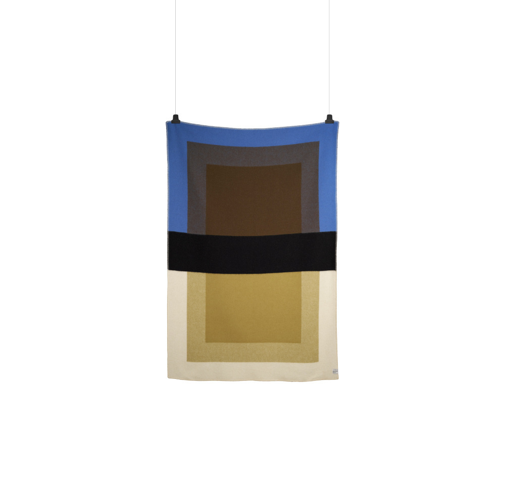 De Bento-serie is gemaakt met het oog op veelzijdigheid en een evenwichtige samenwerking tussen de elementen. De serie heeft drie hoofdfuncties: als zelfstandig object, als een belangrijk onderdeel van de sfeer in een ruimte, en in interactie met het lichaam. De opvallende zwarte "riem" verdeelt de deken visueel in twee delen en geeft het een dynamische, grafische uitstraling. Materiaal: