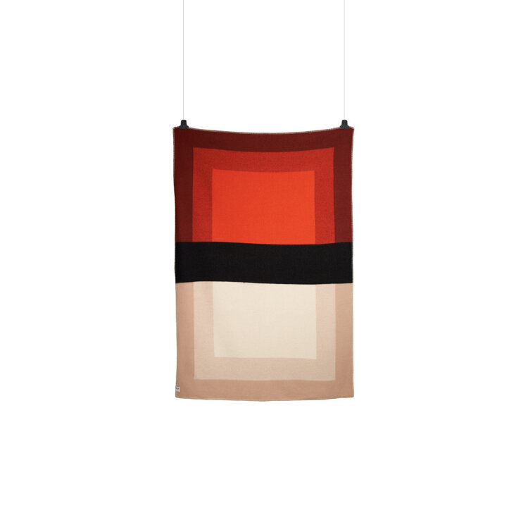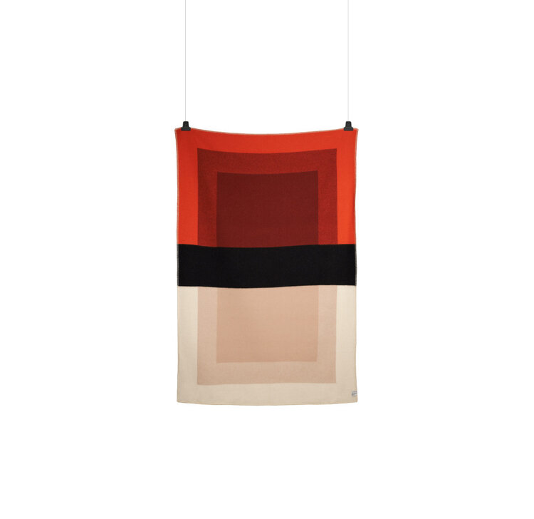 De Bento-serie is gemaakt met het oog op veelzijdigheid en een evenwichtige samenwerking tussen de elementen. De serie heeft drie hoofdfuncties: als zelfstandig object, als een belangrijk onderdeel van de sfeer in een ruimte, en in interactie met het lichaam. De opvallende zwarte "riem" verdeelt de deken visueel in twee delen en geeft het een dynamische, grafische uitstraling. Materiaal: