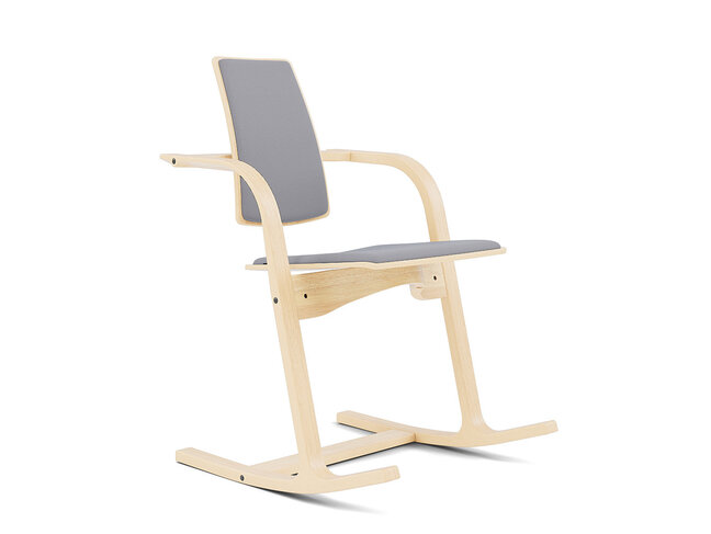 Bewegend zitten gaat moeiteloos op de Actulum. Kantel naar voren of leun achterover en de gebogen houten lopers creëren een schommeleffect die reageert op de natuurlijke beweging van uw lichaam. Actulum heeft een slanke rugleuning met een flexibel gewricht. dat is bedoeld om een zo groot mogelijk aantal zitposities mogelijk te maken. De gestoffeerde rug- en zitkussens zorgen voor een zacht oppervlak, zonder de luchtige uitstraling van de stoel weg te nemen.
